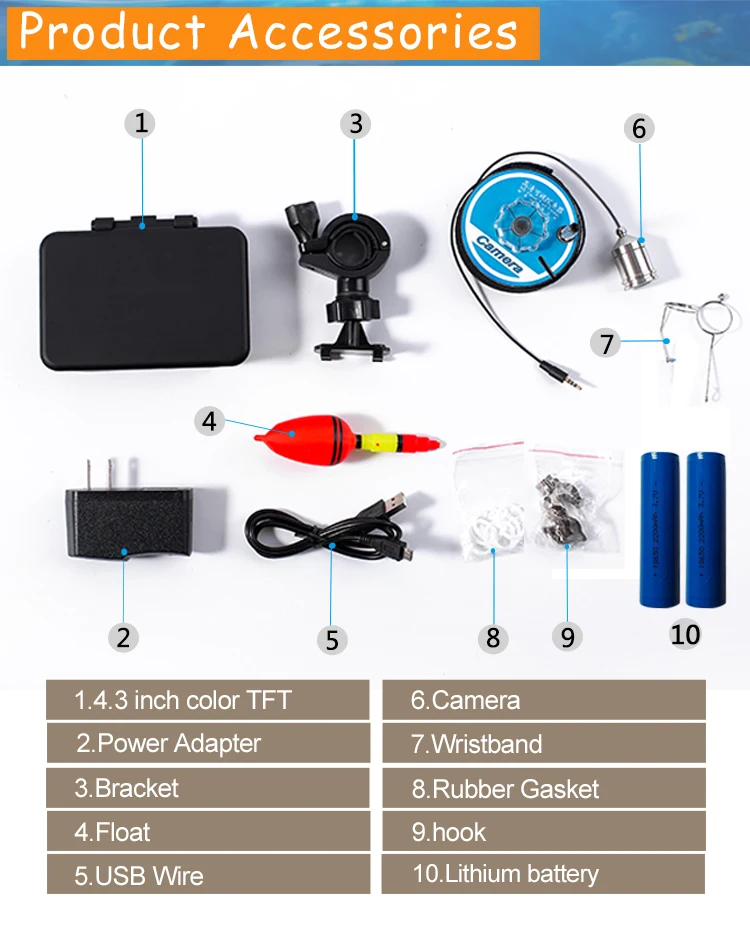 1¡¢ 4.3inch LCD monitor 2¡¢Camera 3¡¢5VPower Adapter 4¡¢USB Wire 5¡¢Bracket 6¡¢ Float 7¡¢Horizontal wire 8¡¢Vertical wire 9¡¢Fixed ring
